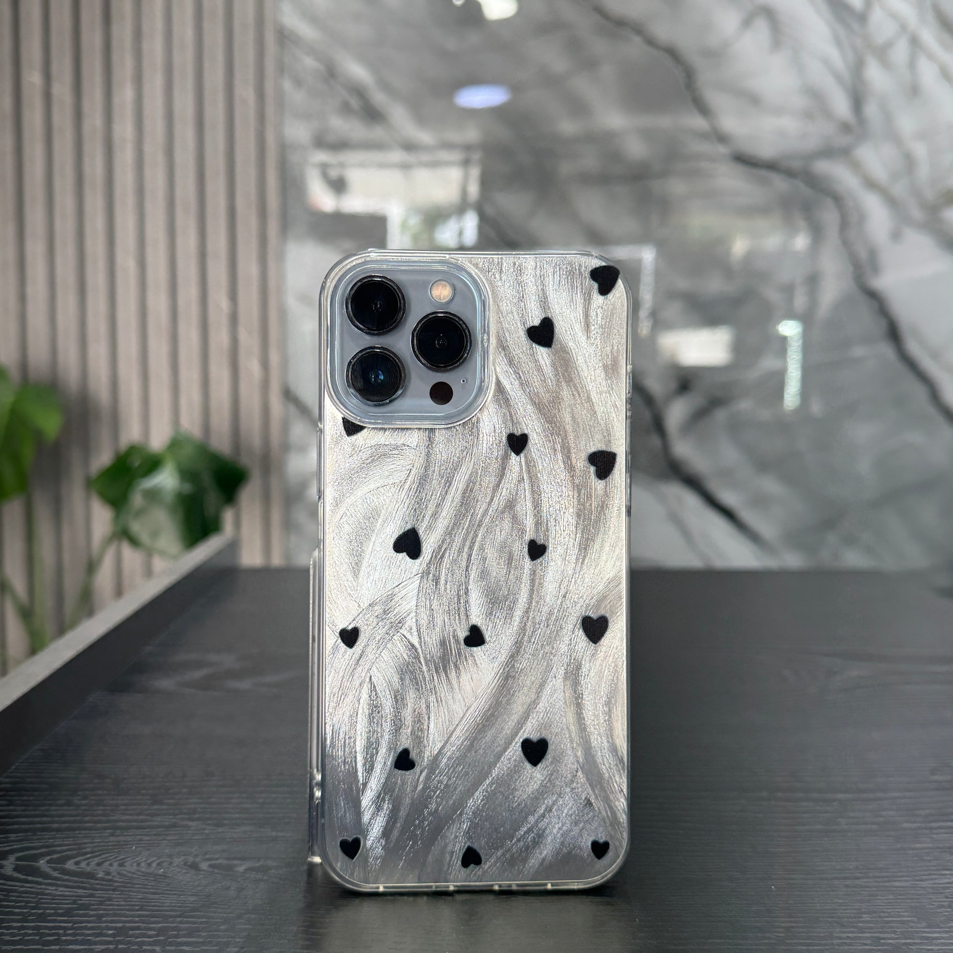 Case Plateado corazones negros